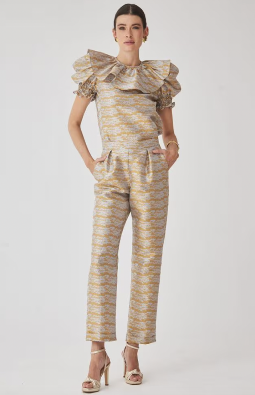 Un ensemble top et pantalon en jacquard doré et argenté, avec col volanté XXL et manches froncées. Une pièce lumineuse et chic, idéale pour mariages, soirées et événements habillés.